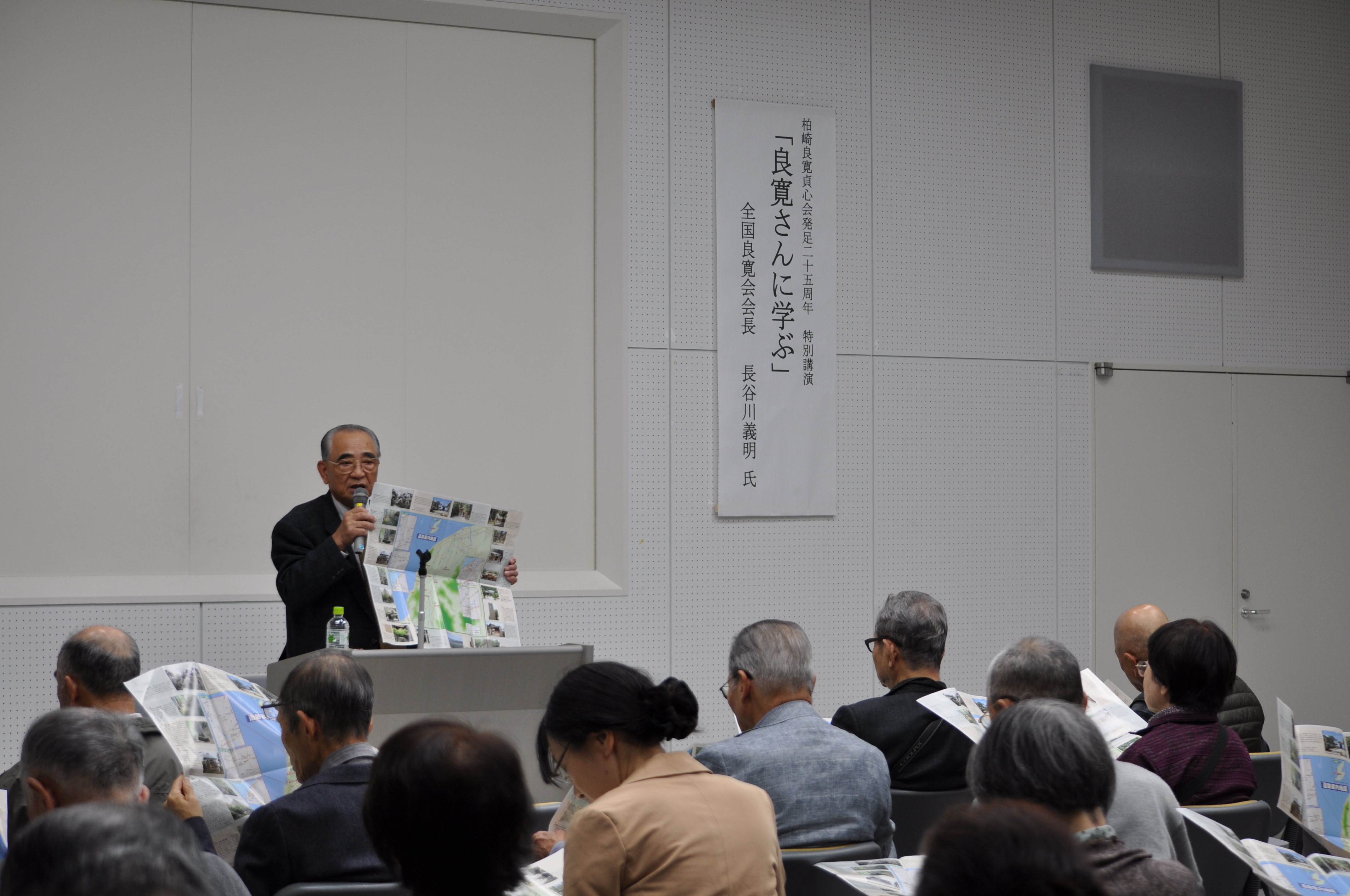 先般11月3日、柏崎市立図書館(ソフィアセンター)で、柏崎良寛貞心会発足25周年記念事業(柏崎市立図書館共催)、全国良寛会会長 長谷川義明氏(前新潟市長)を講師に迎え、特別講演(演題:良寛さんに学ぶ)が開催されました。会場は80名の大勢の方からお越しいただき有難うございました。