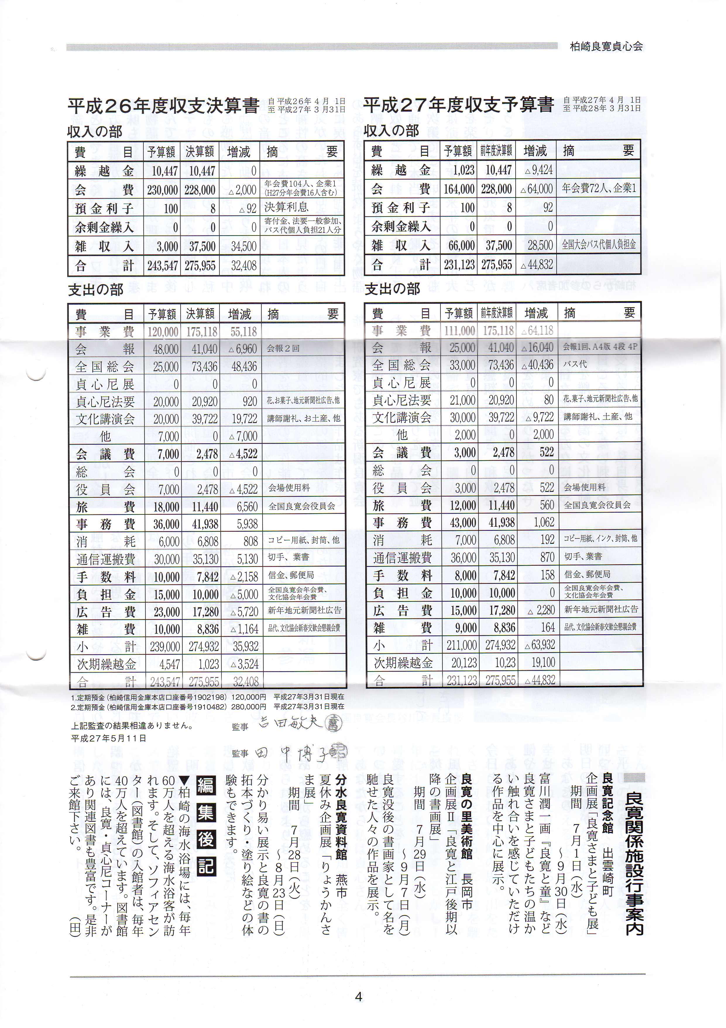26年度決算報告、27年度収支予算等が掲載されています。
