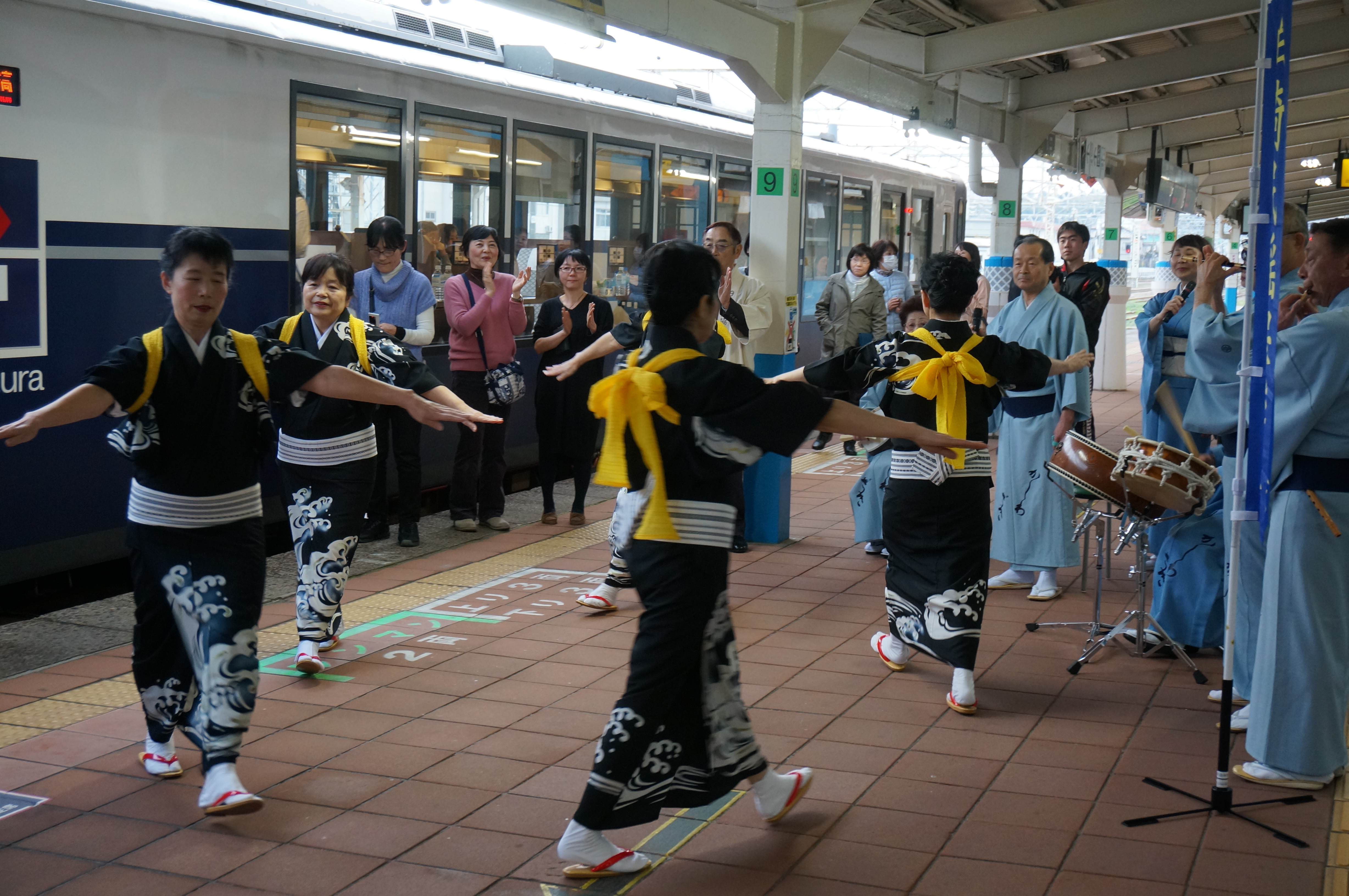 越乃Shu米Kura列車が3月18日柏崎駅に停車、柏崎民謡保存会では歓迎のイベントが1番線ホームで行われ柏崎の民謡を披露しました。