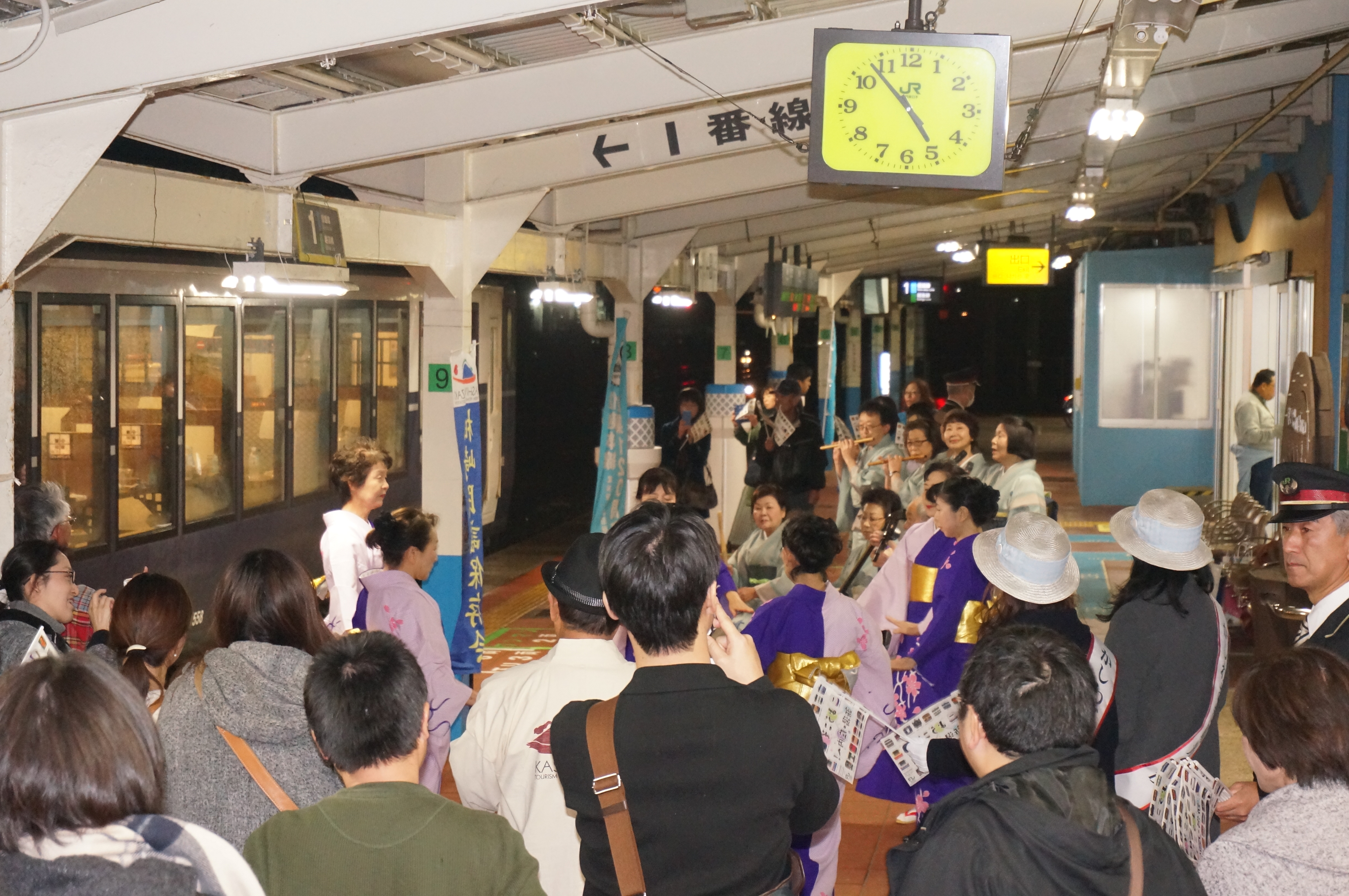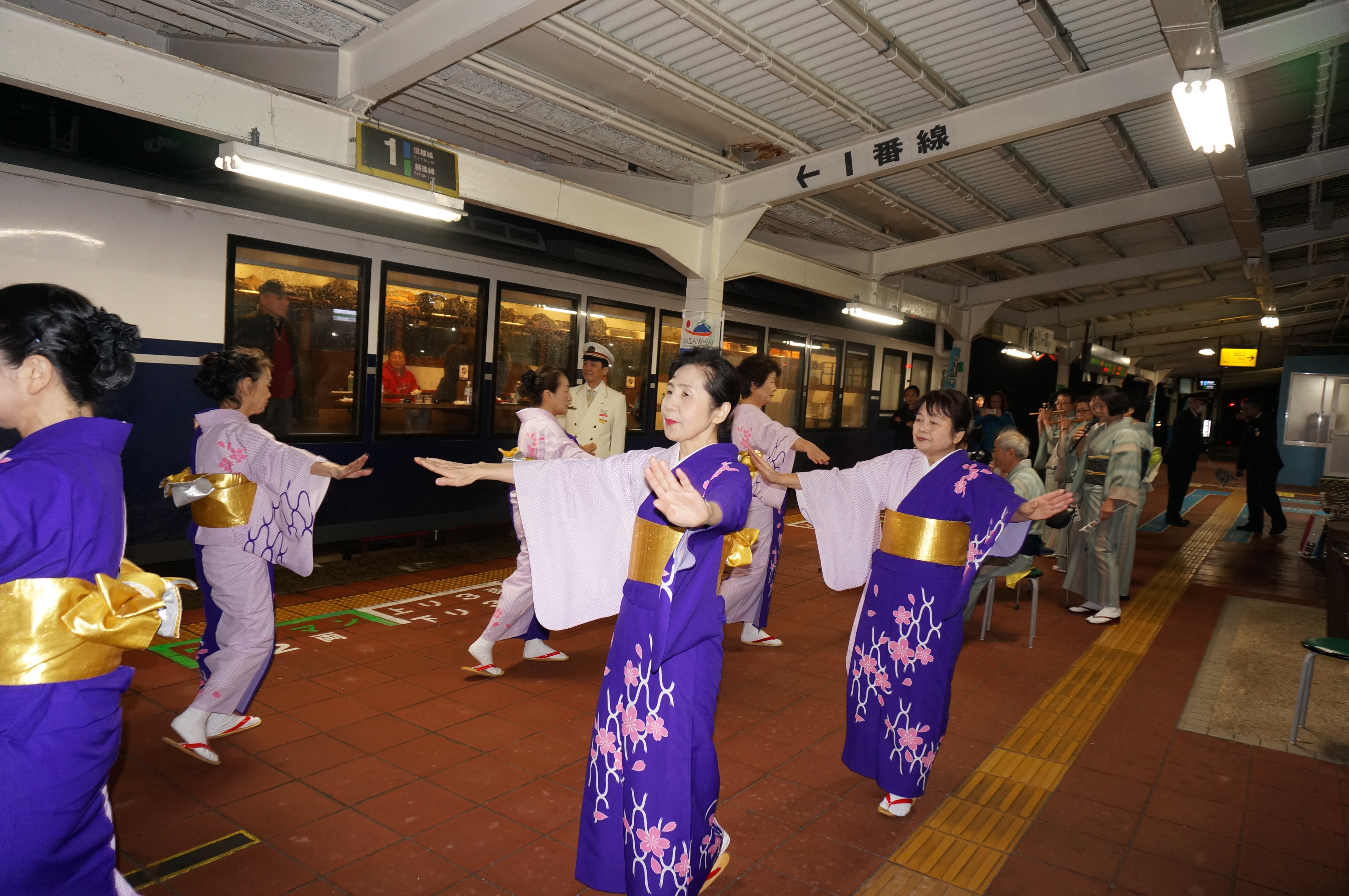 JR越乃米Sukura号年内最終運行が柏崎駅に10分間停車しました。柏崎民謡保存会では最終運行を記念に民謡を2曲を乗客に披露をしました。乗客もホームに降り手拍子で停車時間の一時を楽しんで頂きました。民謡はご当地の「お座敷三階節」と日本民謡の代表曲「佐渡おけさ」の2曲を披露しました。柏﨑の2名の観光大使も加わり盛り上げました。Sukura号は来年も柏崎駅に来られることで柏崎路を後にした。