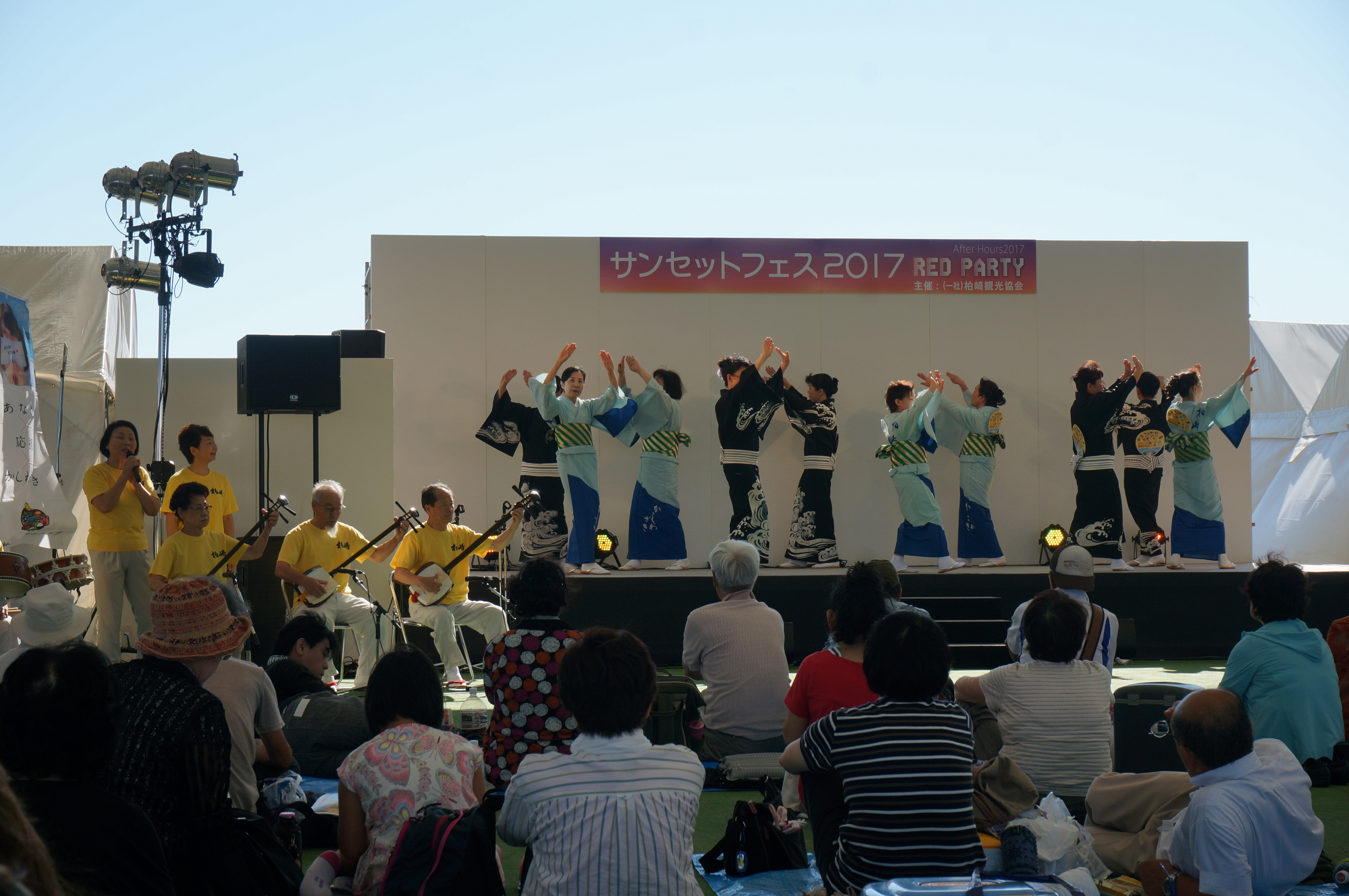 柏崎ぎおんまつりでは恒例の民謡街頭流しが雨の為、中止でしたが、7月26日ぎおんまつりを最後を飾る花火大会は雨も心配なく盛大に開催されました。花火の前のオープニングで柏崎の民謡が披露されました。